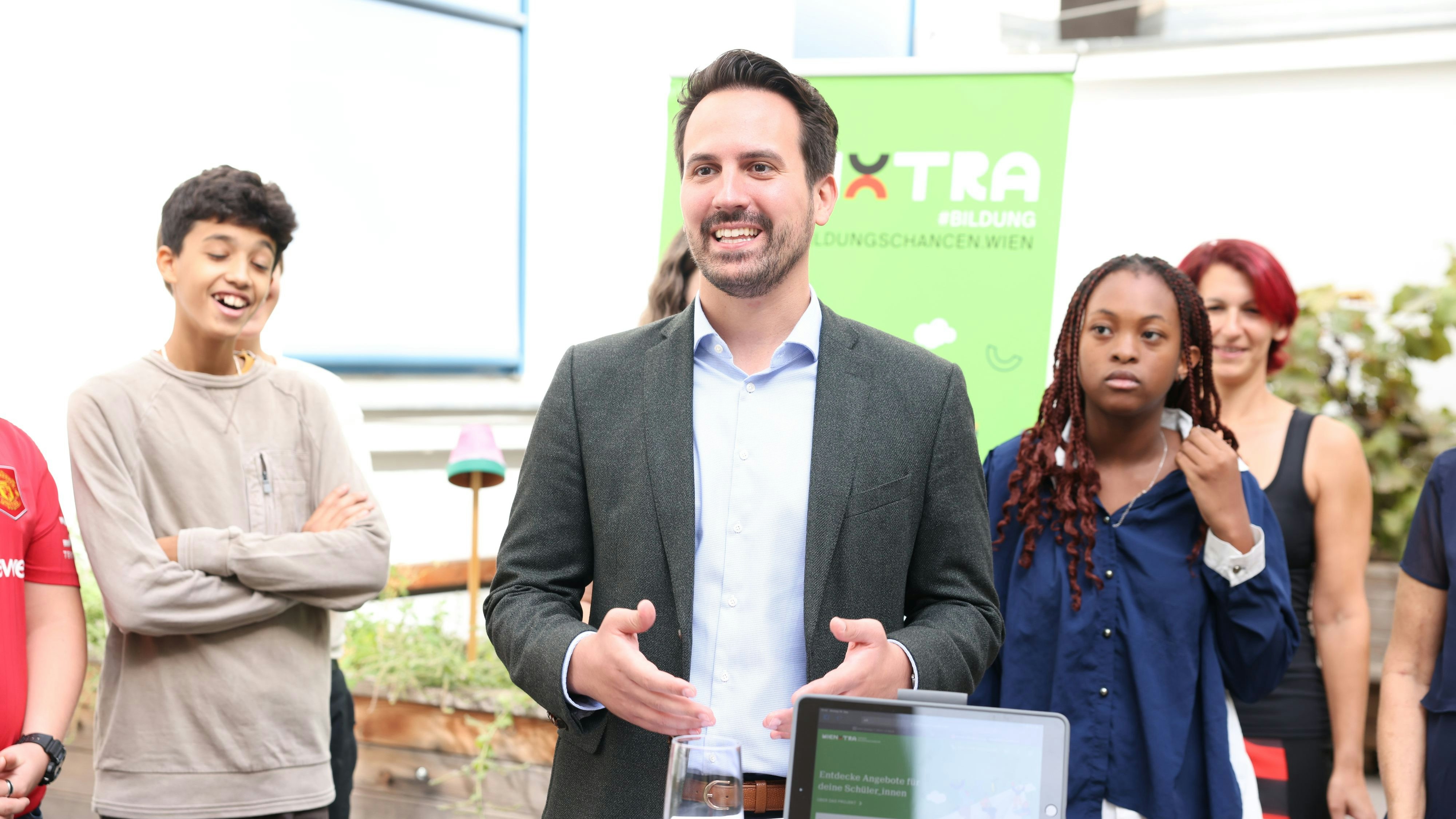 Bildungsstadtrat Christoph Wiederkehr bei der Präsentation der Wiener Bildungschancen in der Mittelschule Pazmanitengasse (Wien-Leopoldau).