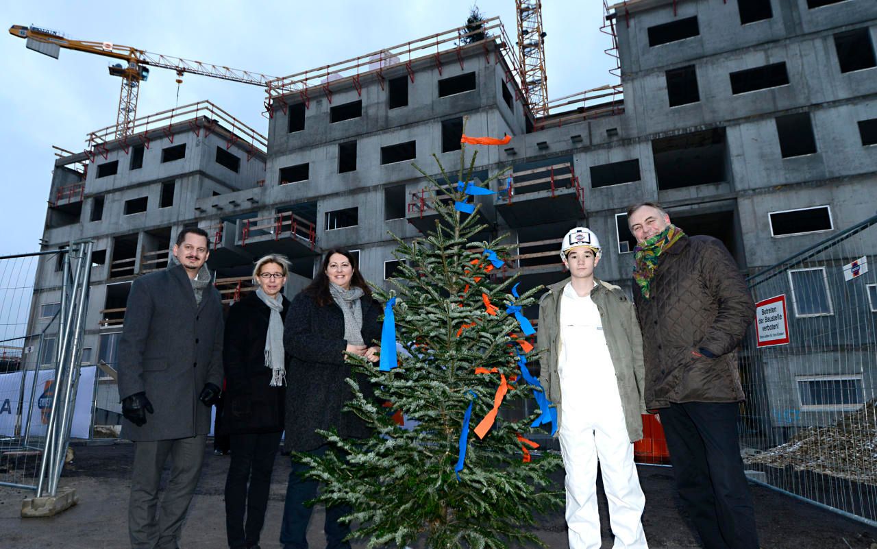 Gleichenfeier für Gemeindebau Neu in der Fontanastrasse (Favoriten): v.l.n.r.: Bezirksvorsteher Marcus Franz, Direktorin Wiener Wohnen Karin Ramser, Wohnbaustadträtin Kathrin Gaal, Lehrling Shala Valdrin und Gesiba-Generaldirektor Ewald Kirschner. (c) PID/Alexandra Kromus