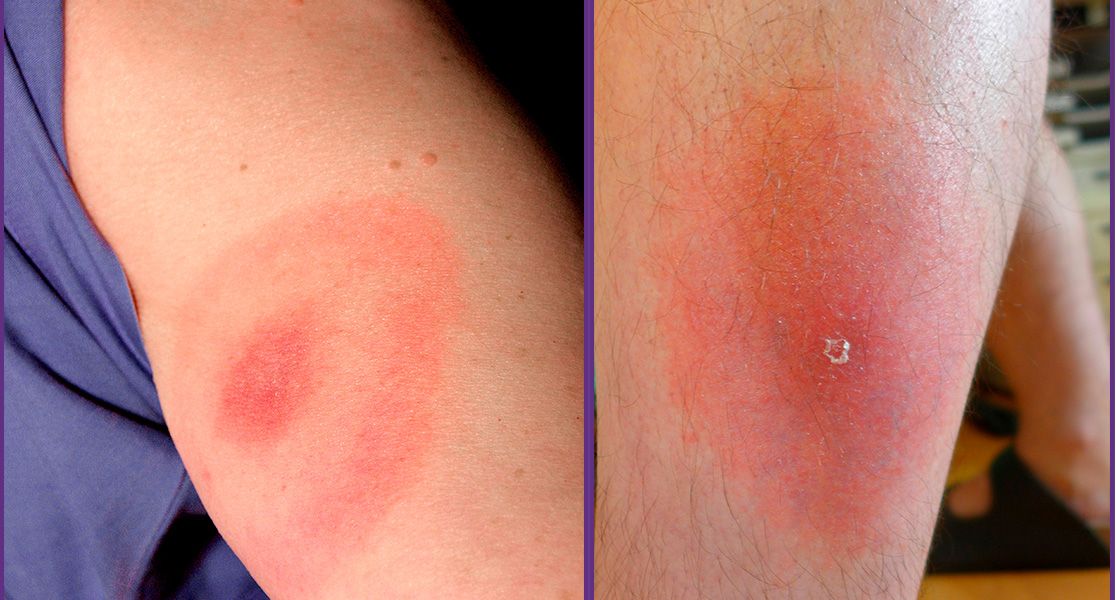 Die mit Abstand häufigste Erkrankungsform ist die sogenannte Wanderröte (siehe Bild). Sie tritt nach einigen Tagen (bis Wochen) nach dem Zeckenstich auf. Diese deutliche ringförmige Hautrötung ist oft im Zentrum blasser als am Rand. Der rote Ring wandert dann allmählich nach außen.