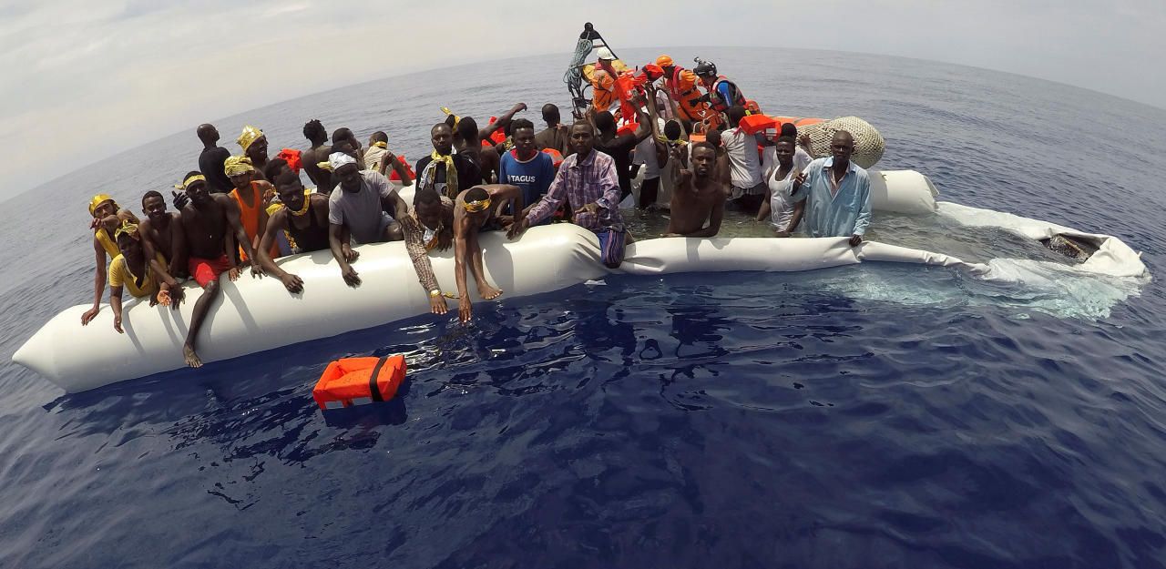 Flüchtlinge auf einem Schlauchboot im Mittelmeer.