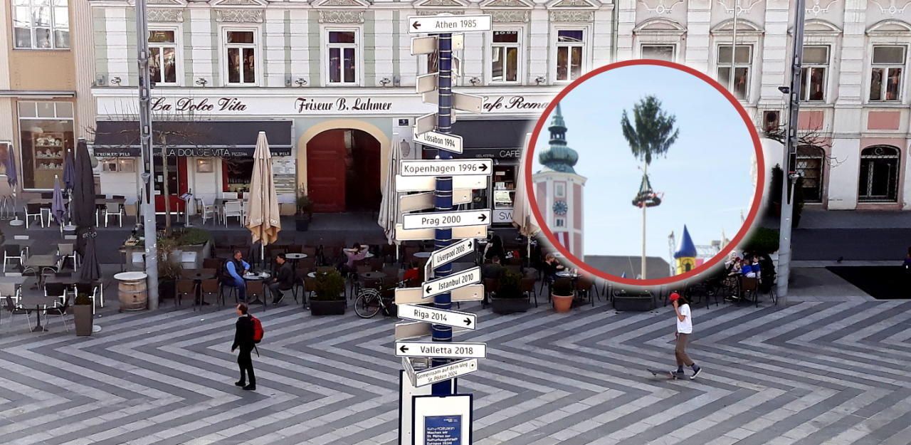 Kultur-Wegweiser statt Maibaum am St. Pöltner Rathausplatz.