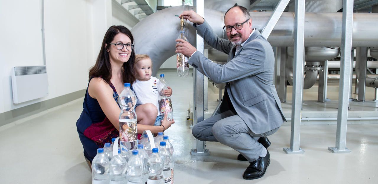 EVN Wasser-Geschäftsführer Raimund Paschinger beim Abfüllen der letzten Flaschen, auch die kleine Luisa und ihre Mama Daniela würden im Falle einer Krisensituation von den Trinkwasserflaschen der EVN Wasser profitieren.