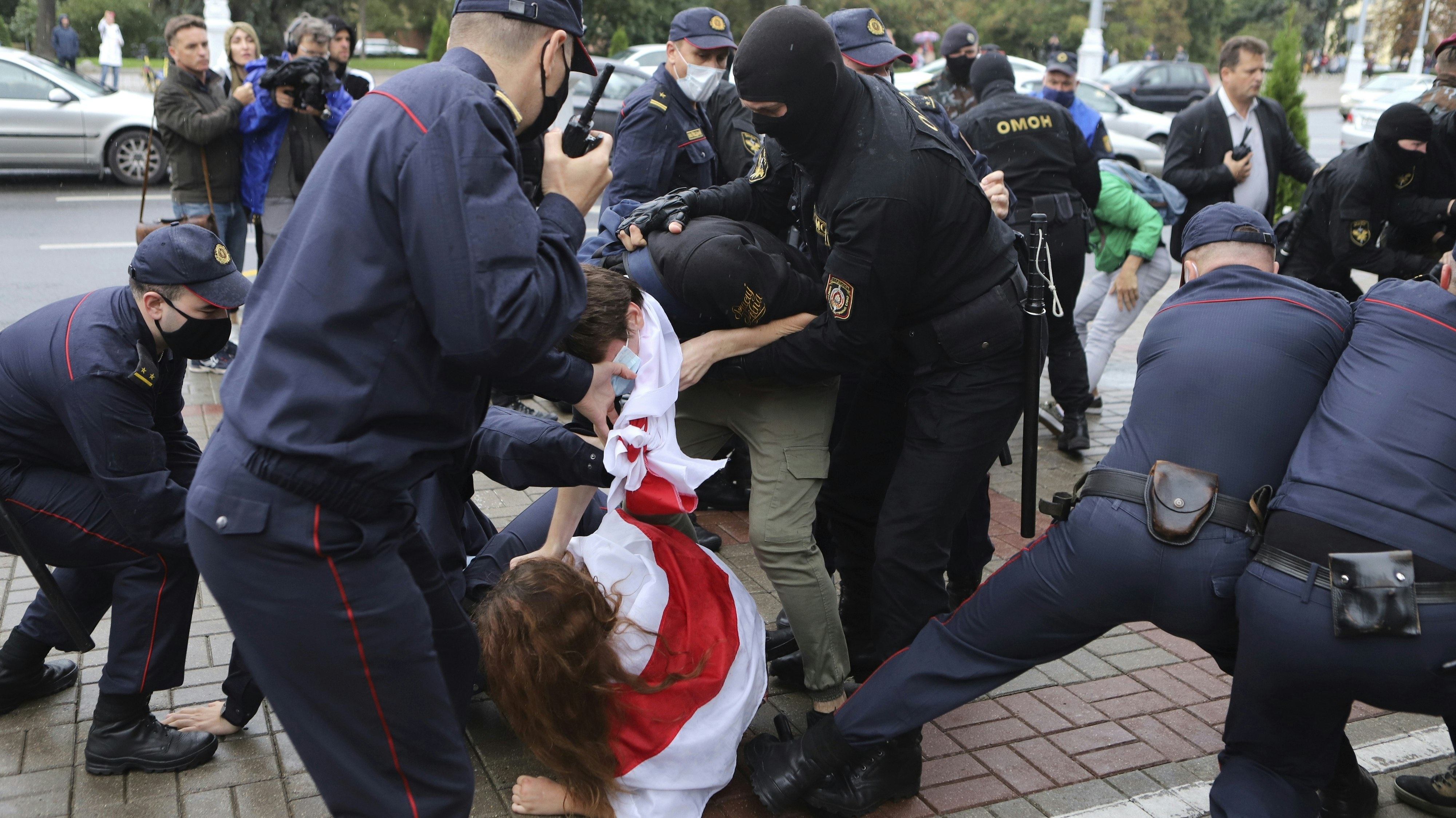 Weißrussiche Sicherheitskräfte überwältigen die Demonstranten.