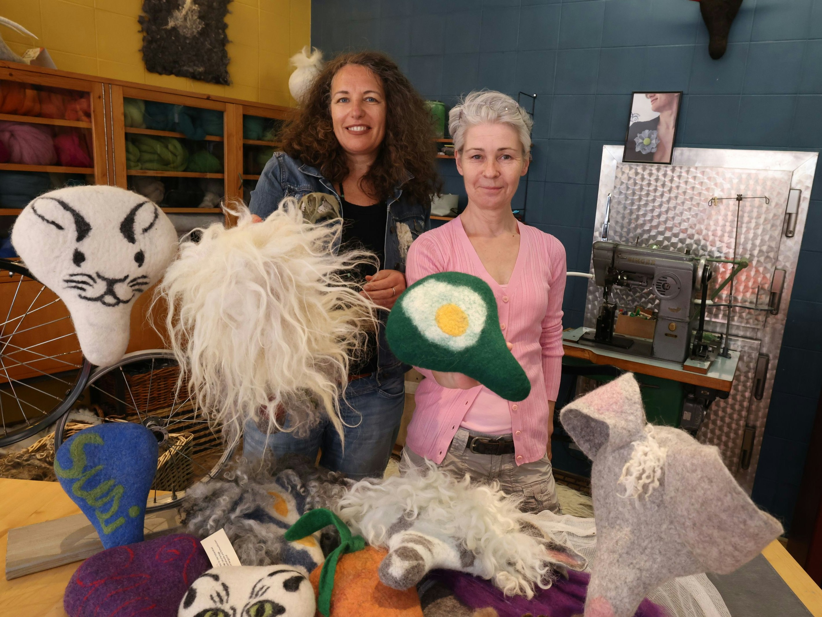 Dalia Sarig-Fellner (links) und Ruth Freitag (rechts) filzen mit Vivi, der dritten im Bunde, den "Foschl".