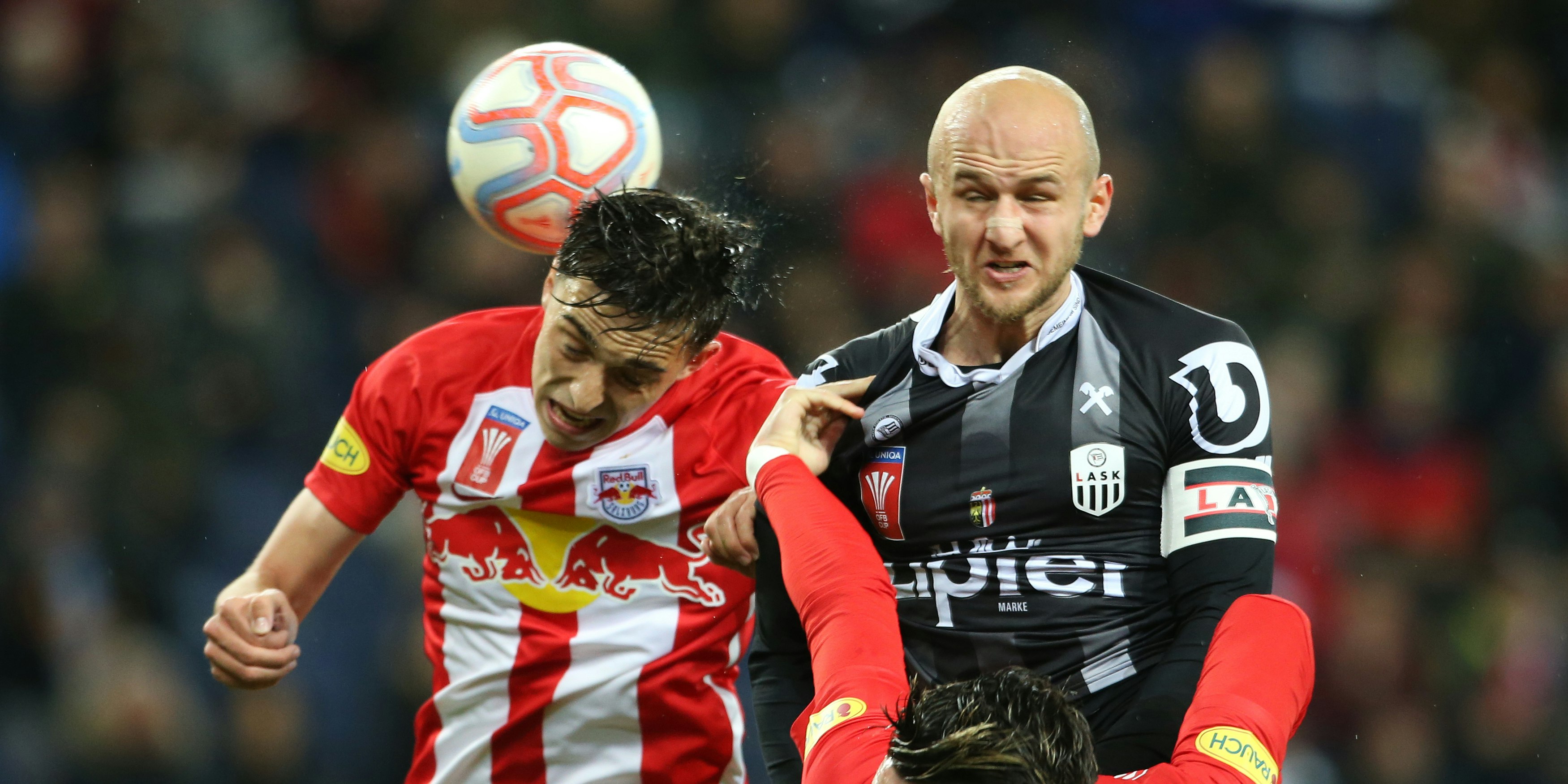 Salzburgs Albert Vallci und LASK-Kapitän Gernot Trauner im Luftzweikampf.