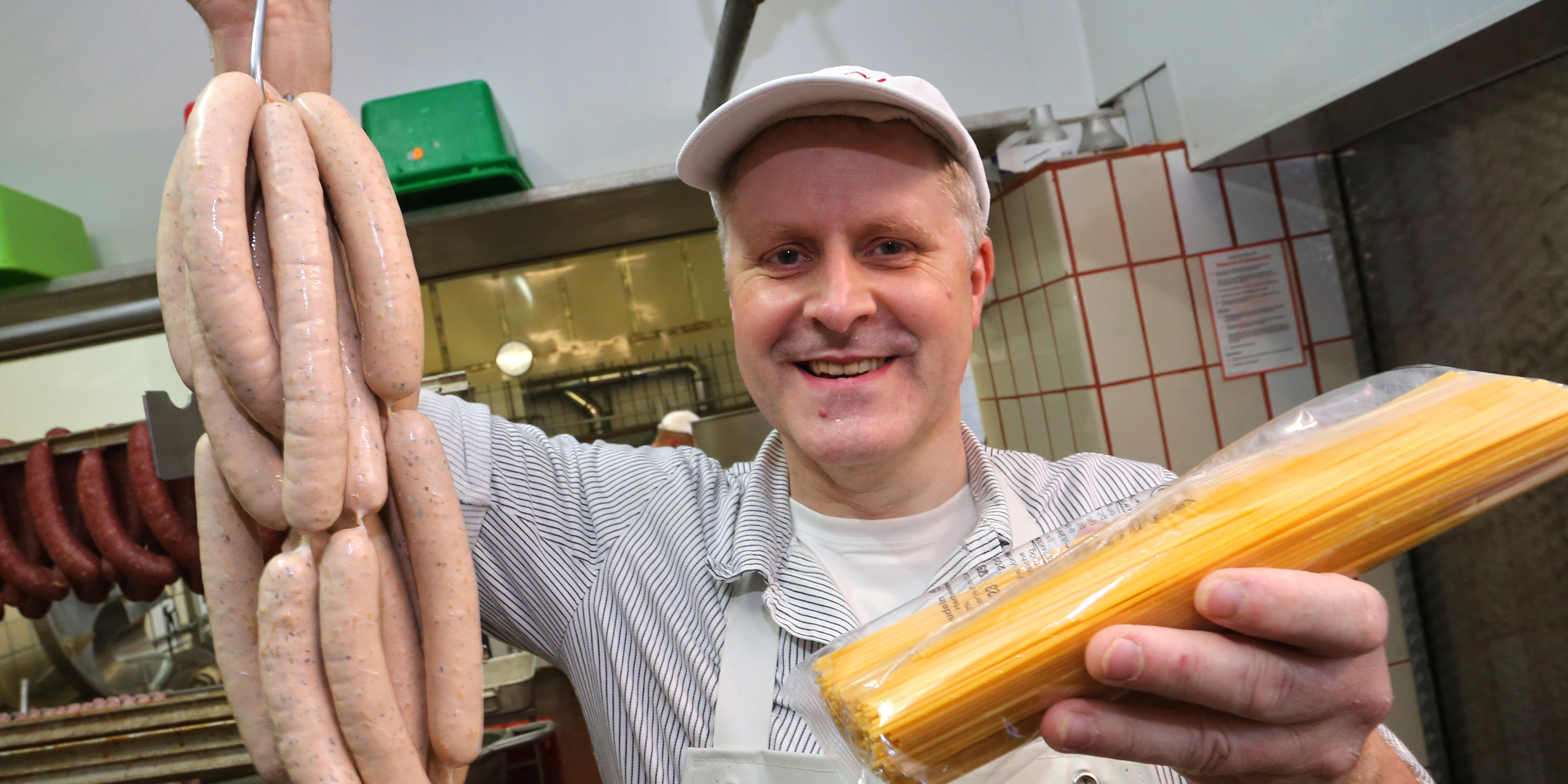 Matthias Freund präsentiert seine "Spaghetti Bolognese"-Wurst.