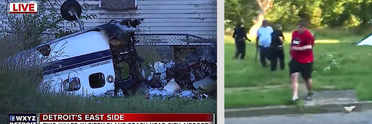 Nicht zu glauben: Nach dem Absturz geht die Cessna in Flammen auf, aber Peyton B. (re., rotes Shirt) springt aus dem brennenden Wrack.