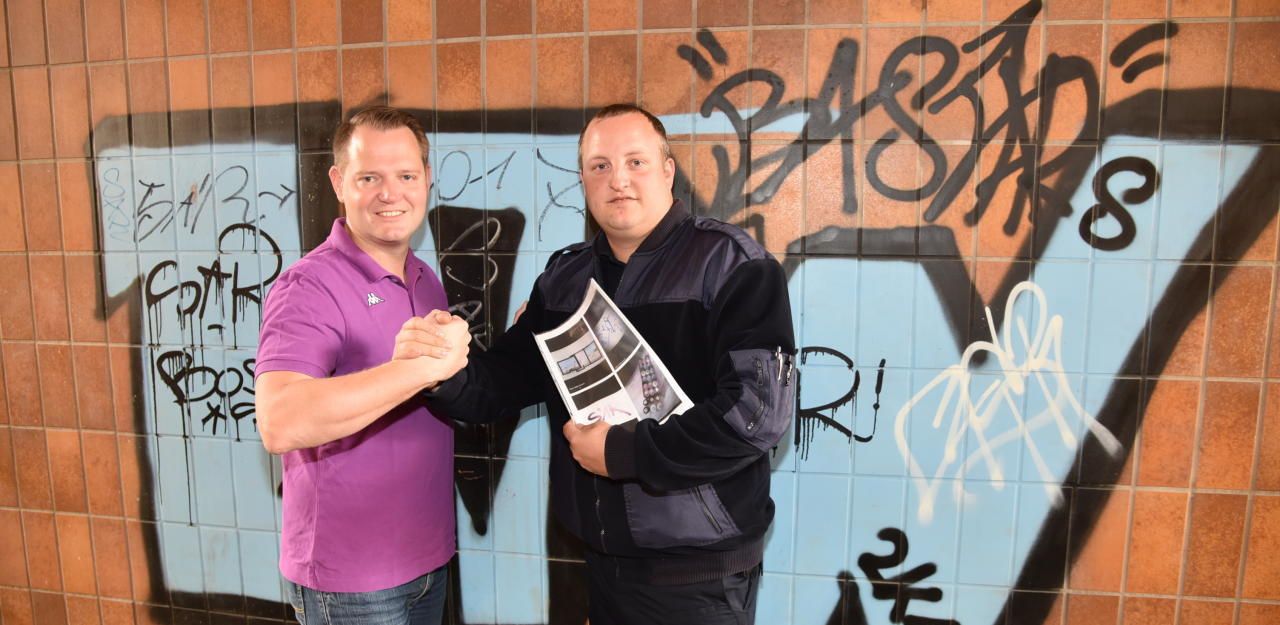 Gerhard Zwinz (re.) brachte die Polizei auf die richtige Fährte. Vize-Stadtchef Christian Samwald (li.) ersuchte den Ternitzer, jene Bereiche, an denen geschmiert wurde, im Auge zu behalten.