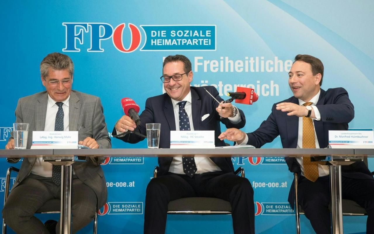 FPÖ-Chef Strache (Mitte) mit OÖ-Klubchef Mahr und dem stv. oö. Landeshauptmann Haimbuchner (re.)