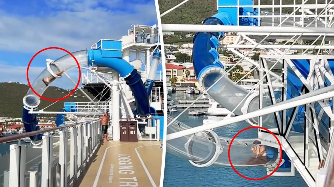 Erst geht es für die Frau in der Rutsche rückwärts zurück und dann sitzt sie fest.