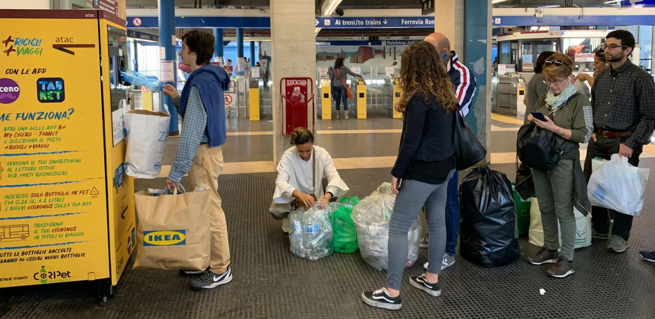 Menschen stehen Schlange, um Plastikflaschen gegen Tickets einzutauschen.