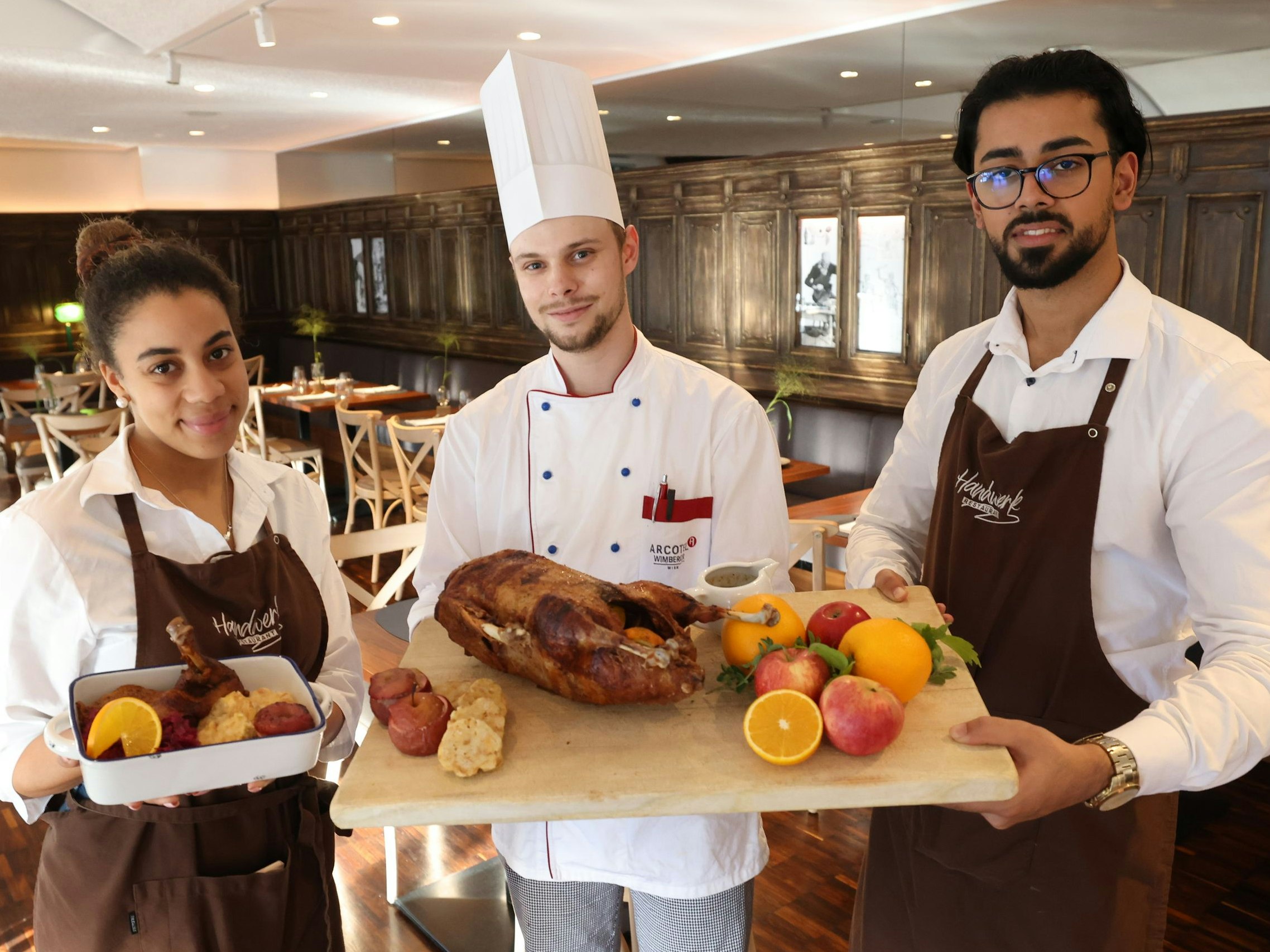 Magdalene (22), Chef de Partie Dominik und Dilawar (20) im Handwerkrestaurant in Wien-Neubau.