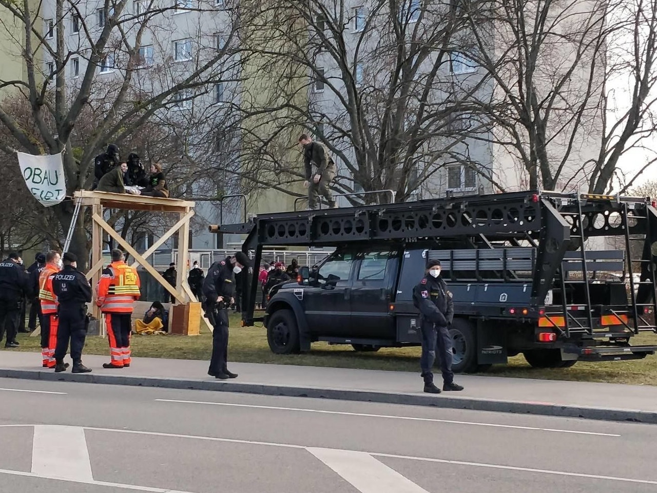 Beamte von Polizei und Wega beendeten in der Wiener Donaustadt eine Protestaktion von Klimaaktivisten.