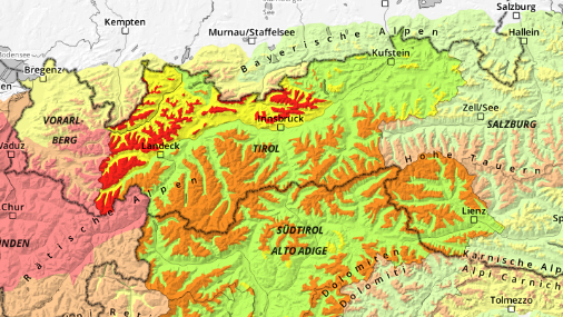 Die globale Erderwärmung verstärkt die Lawinengefahr auch in Tirol. Orange Markierung: "erhebliche Gefahr", rote Markierung: "große Gefahr".
