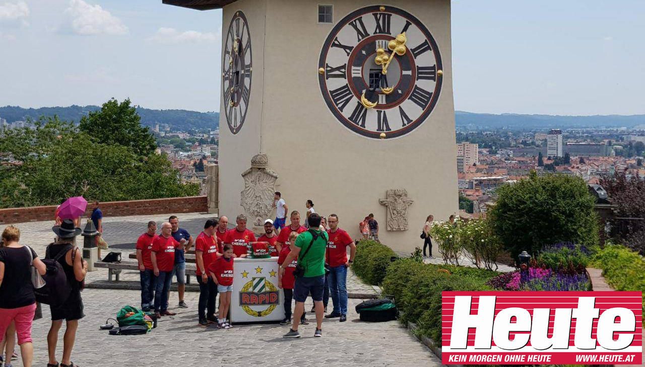 "Heute" wurde ein erstes Bild des neuen Rapid-Trikots am Grazer Uhrturm zugespielt. Auch in Linz knipsten die Hütteldorfer Bilder von den neuen Leiberl.