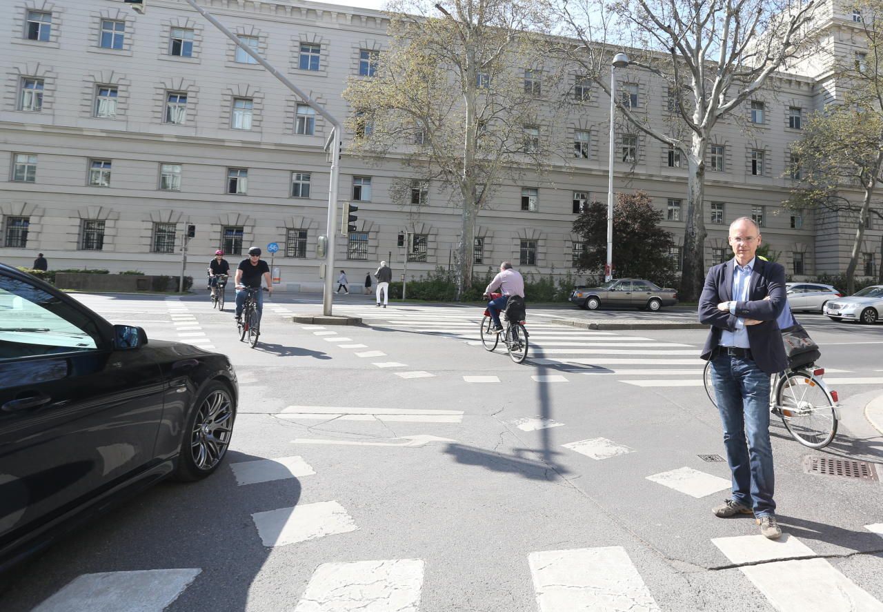 Nationalrat Marcus Franz, selbst Vater eines Schulkindes, an der Kreuzung Landesgerichtsstraße/ Grillparzerstraße in der Josefstadt. Er ist überzeugt: "Diese Kreuzung ist brandgefährlich!"