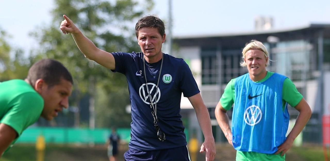 Wolfsburg-Trainer Oliver Glasner (m.) und sein Mittelfeldmotor Xaver Schlager (r.) beim Training (Archivbild)