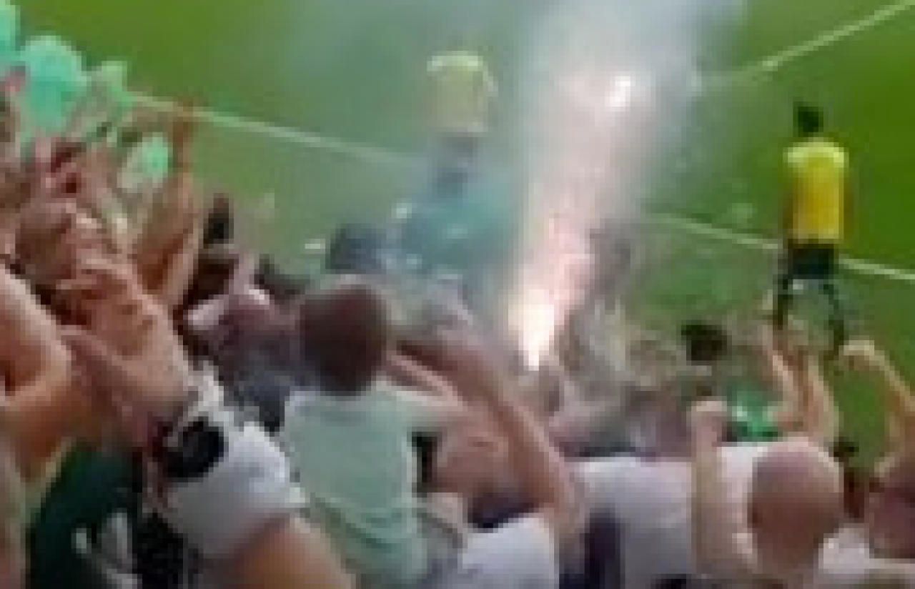 Ein Kind hält eine Blendgranate im Ferencvaros-Stadion kurz darauf explodiert das Gerät