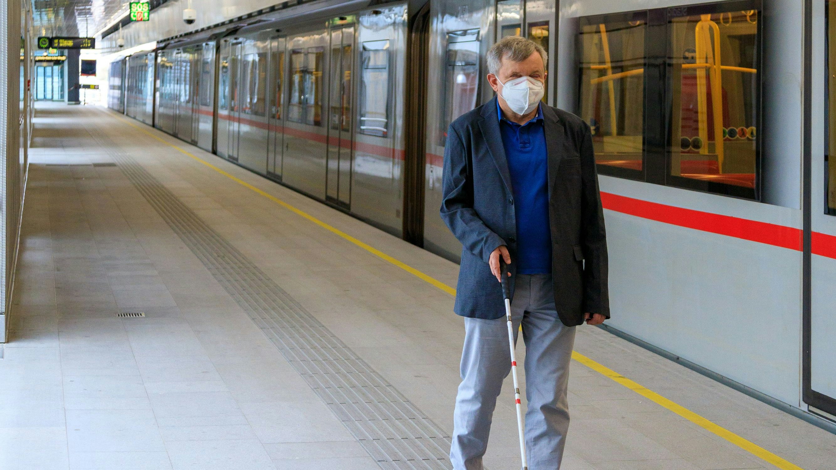 Ein blinder Mann mit Langstock wartet in Wien auf die U-Bahn – ab 2026 kostet ihn das Öffi-Fahren 300 Euro im Jahr.