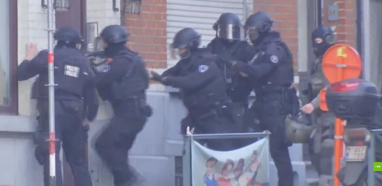 Spezialeinheiten der Polizei umstellen ein Gebäude in Forest/Vorst.