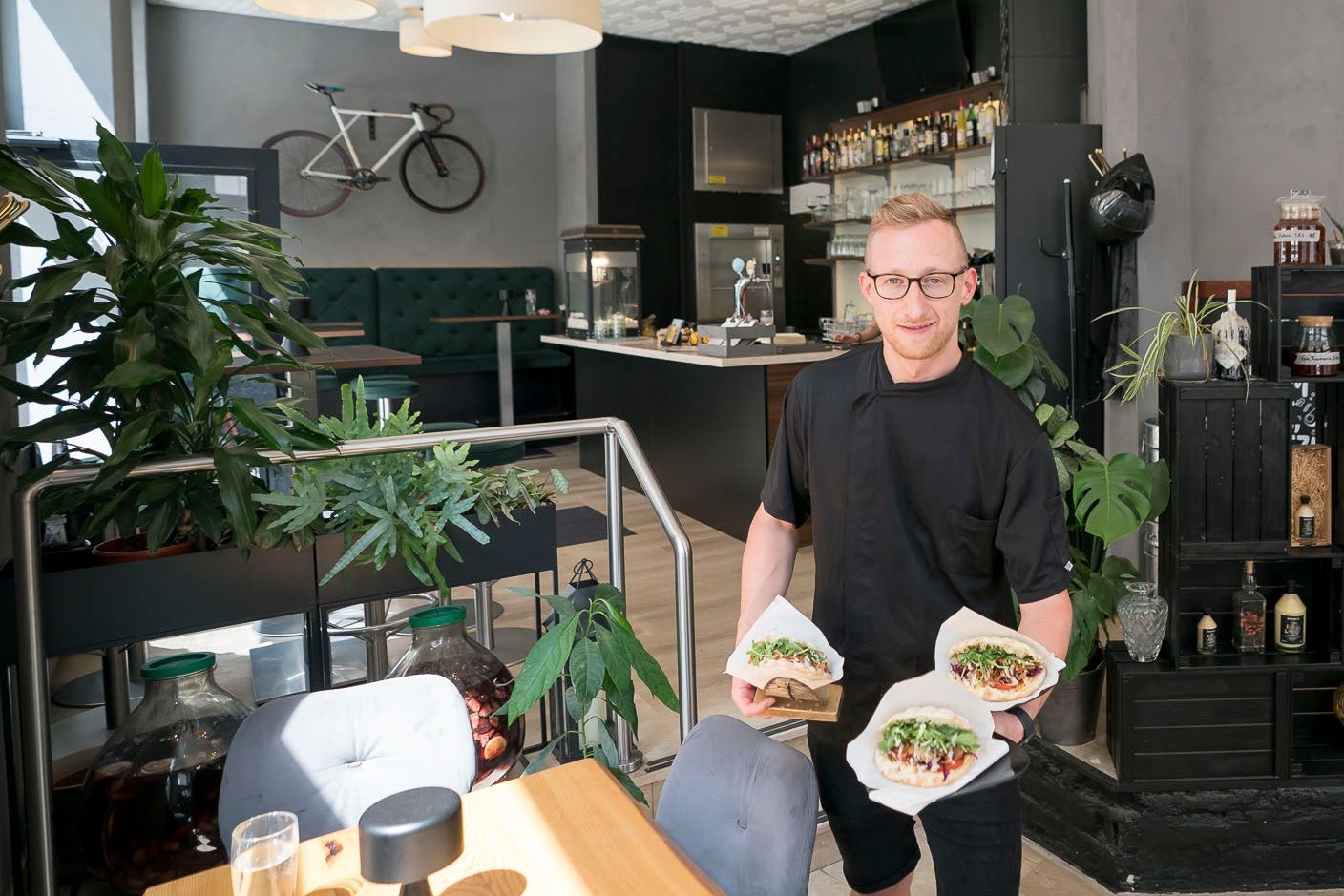 Daniel Hnolik (29) und seine Edel Döner mit Trüffel-Lachs, Pulled Pork oder vegan mit Jackfrucht (v.l.)