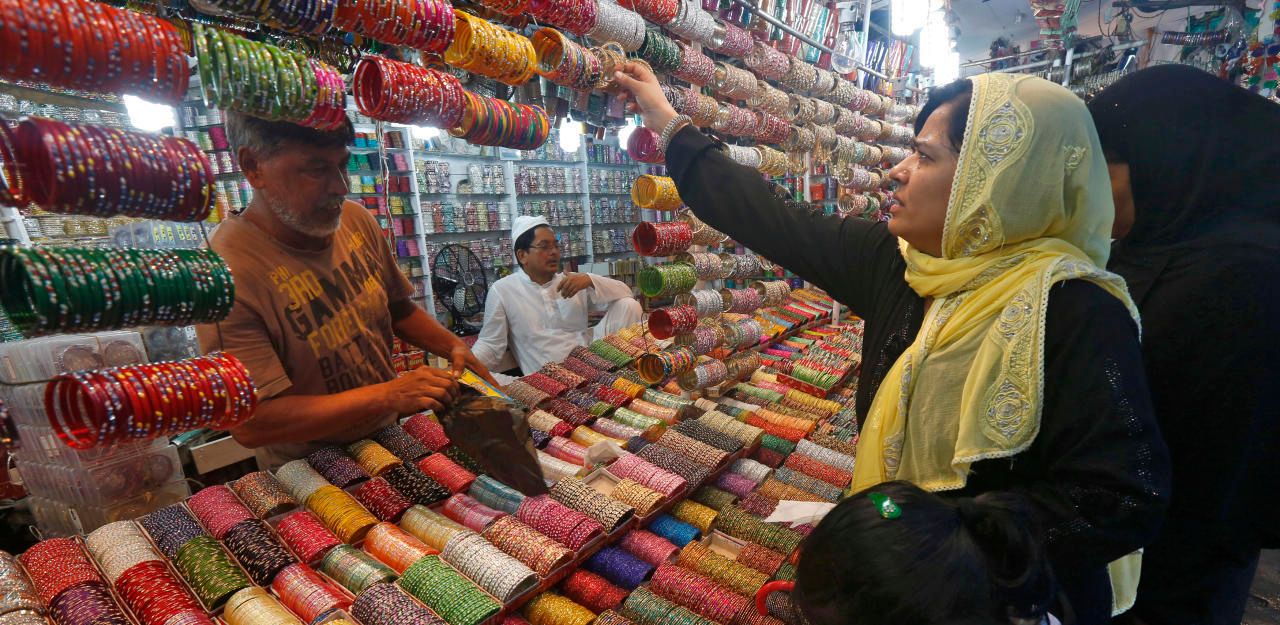 Eine Frau begutachtet Armreife an einem Stand auf einem Markt in Kalkutta, Indien. Symbolfoto