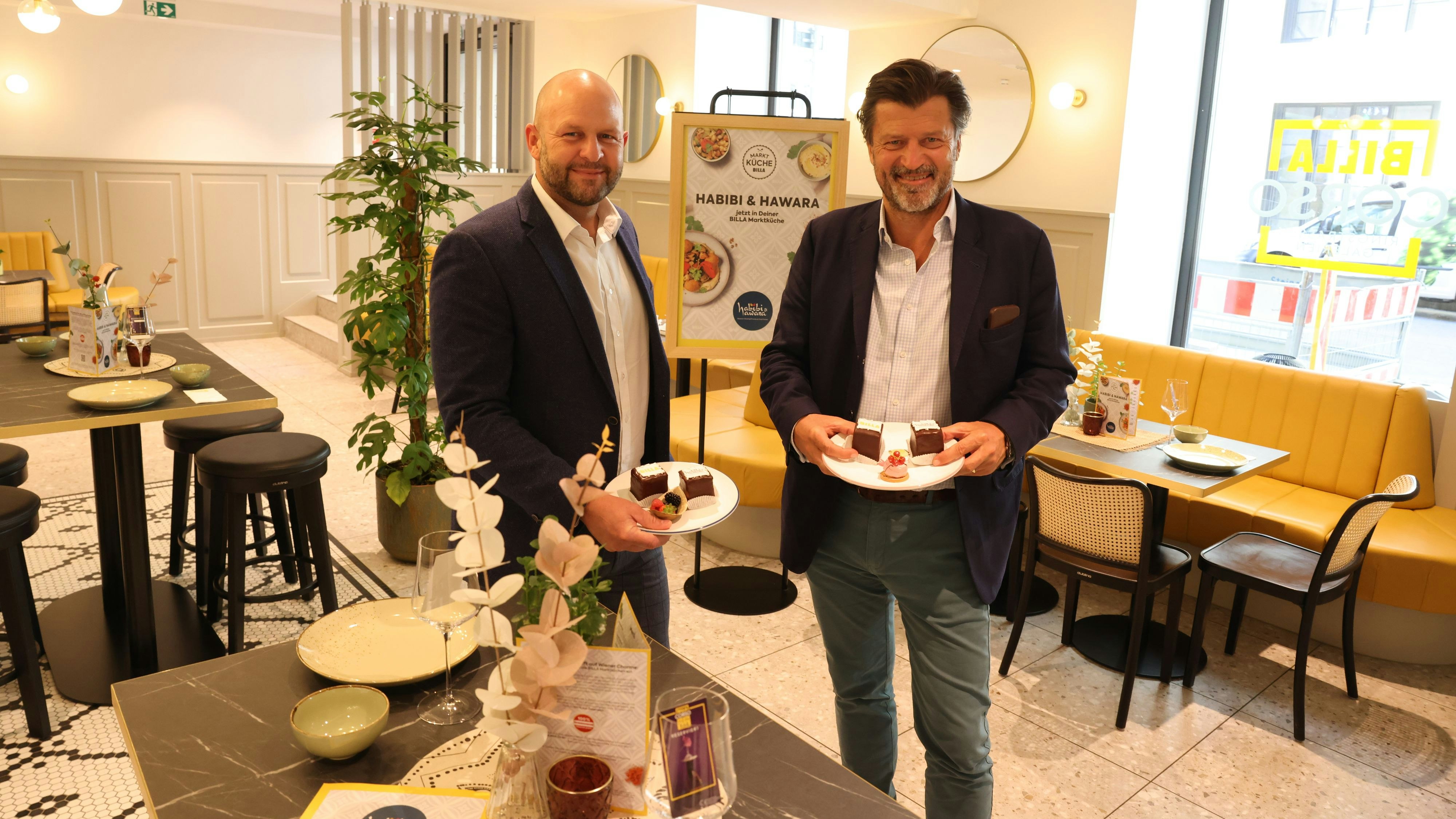 Billa-Vorstand Harald Mießner und Martin Rohla, Gründer von Habibi & Hawara, stellen die gemeinsame Kooperation vor.