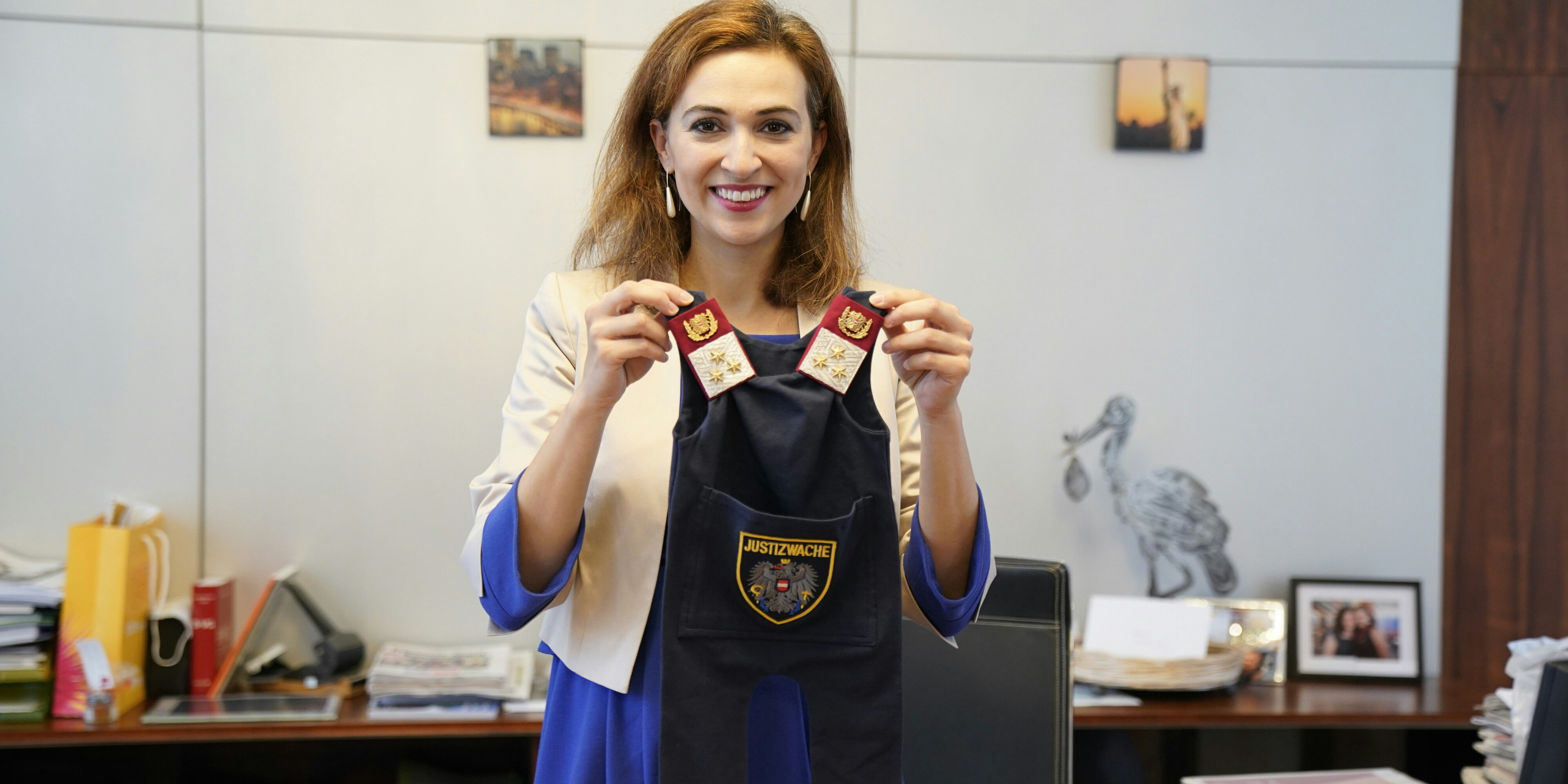 Ministerin Zadić mit dem Justizwache-Strampelanzug