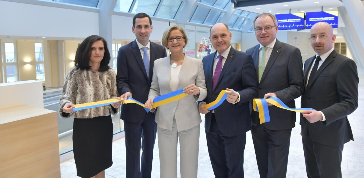 Michaela Gansch, (Pflegedirektorin, Universitätsklinikum St. Pölten), Bernhard Kadlec (Kaufmännischer Direktor, Universitätsklinikum St. Pölten), Landeshauptfrau Johanna Mikl-Leitner, Erster Nationalratspräsident Wolfgang Sobotka, Stellvertreter der Landeshauptfrau Stephan Pernkopf, Thomas Gamsjäger (Ärztlicher Direktor, Universitätsklinikum St. Pölten)