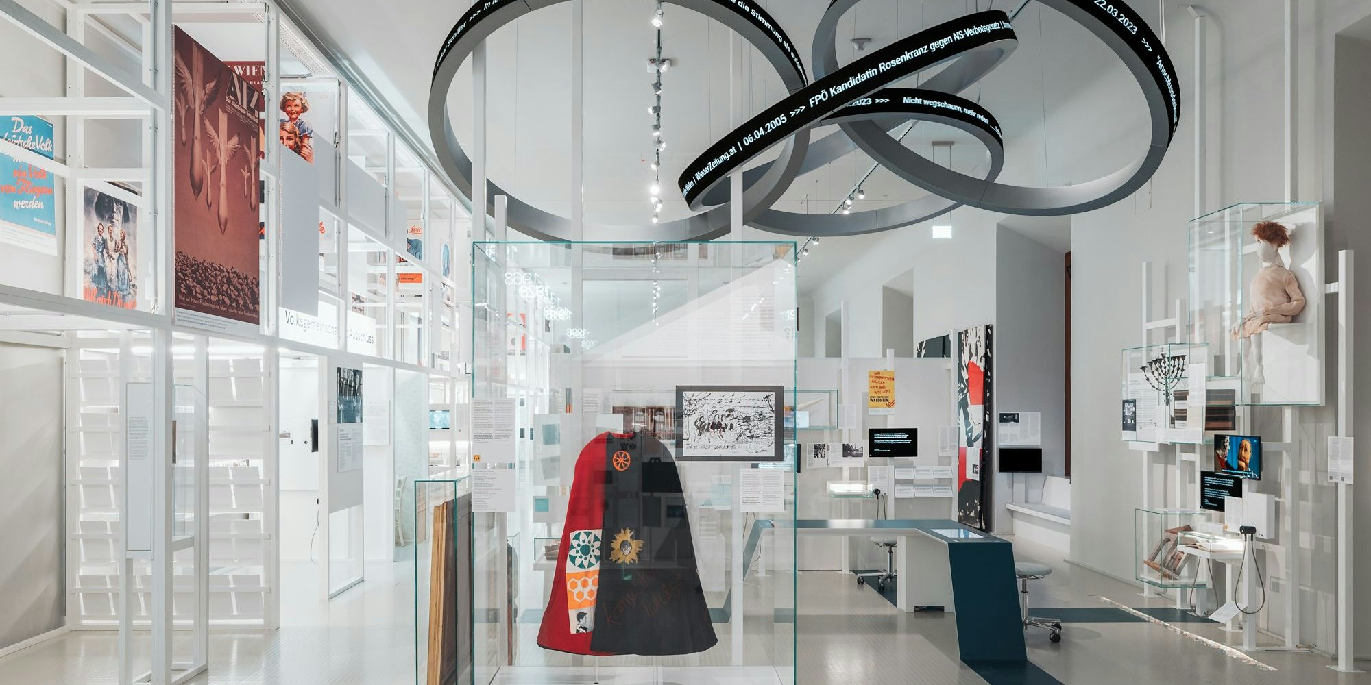 LED-Laufbänder an der Decke, zentral der "Schutzmantel", im Mittelpunkt Österreichs Vergangenheit