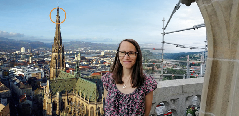 "Heute"-Reporterin Claudia Ruzmarinovic in 112 Metern Höhe am Linzer Mariendom.