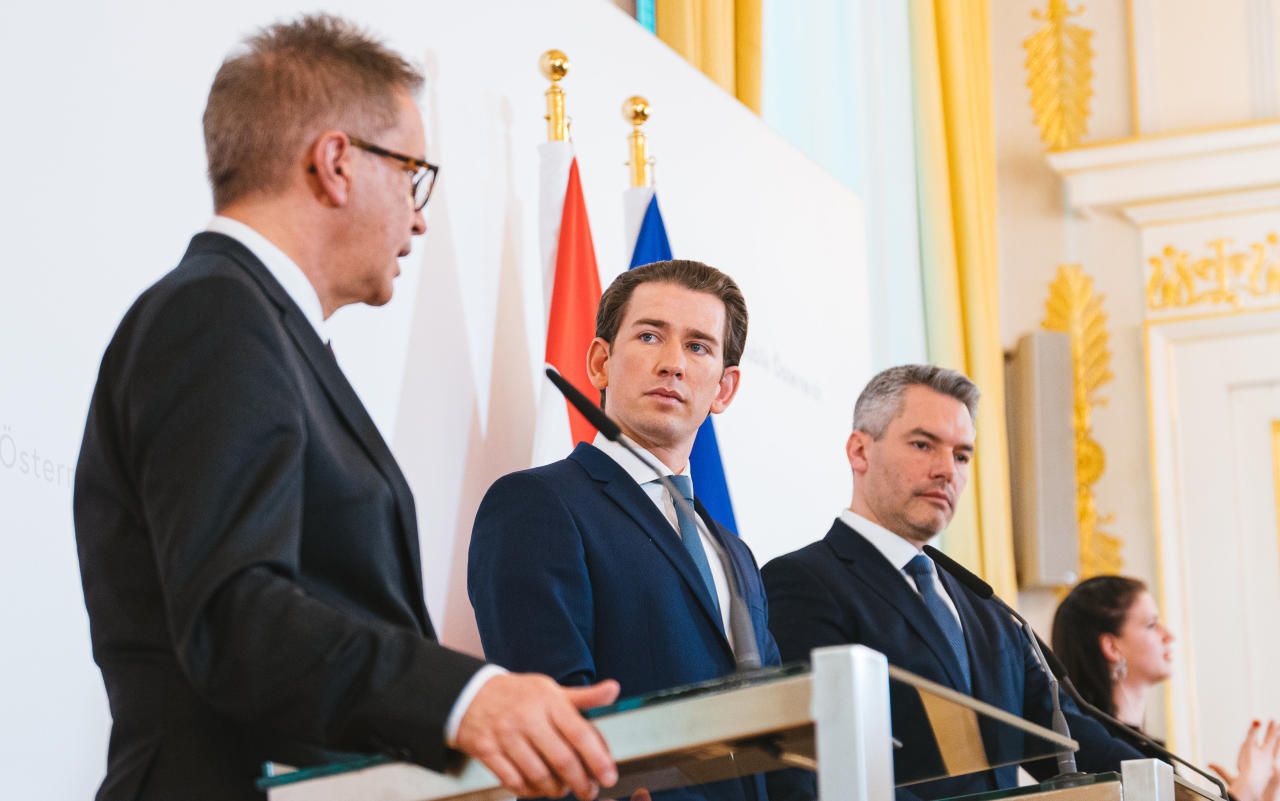 v. l. Gesundheitsminister Rudolf Anschober, Bundeskanzler Sebastian Kurz, Innenminister Karl Nehammer