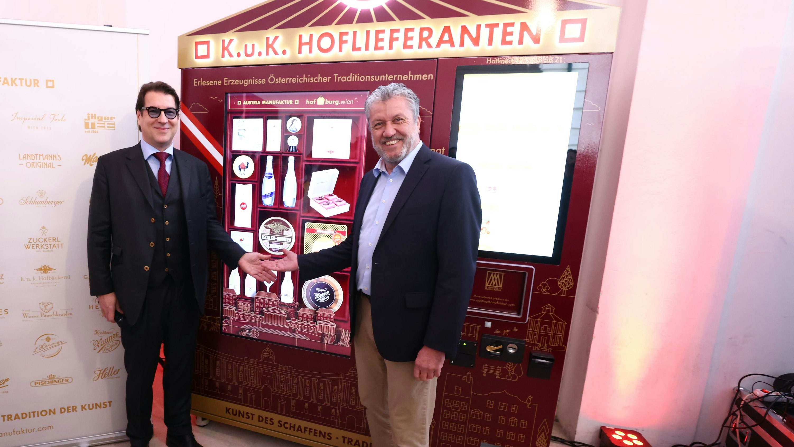 Startup-Gründer Alexander Mantz (li.) und Burghauptmann Reinhold Sahl präsentieren den neuen AUMAT in der Wiener Hofburg.
