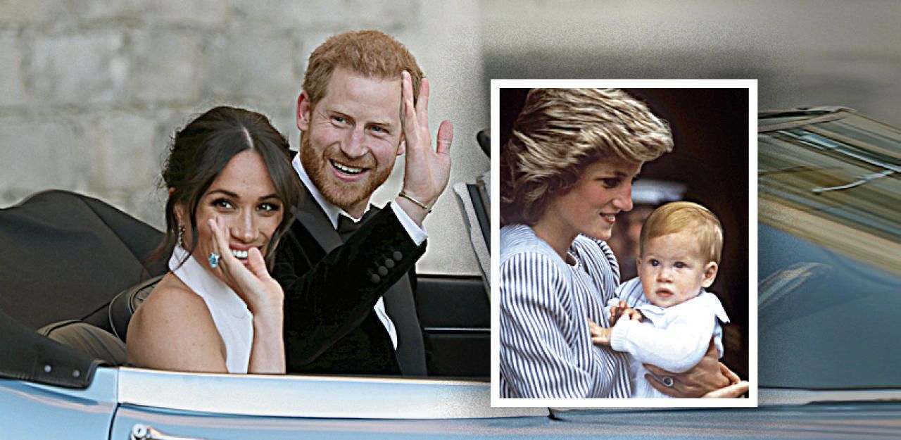 Braut Meghan trug Dianas Ring (li.). Rechts: Harry mit seiner Mutter ( 1997)