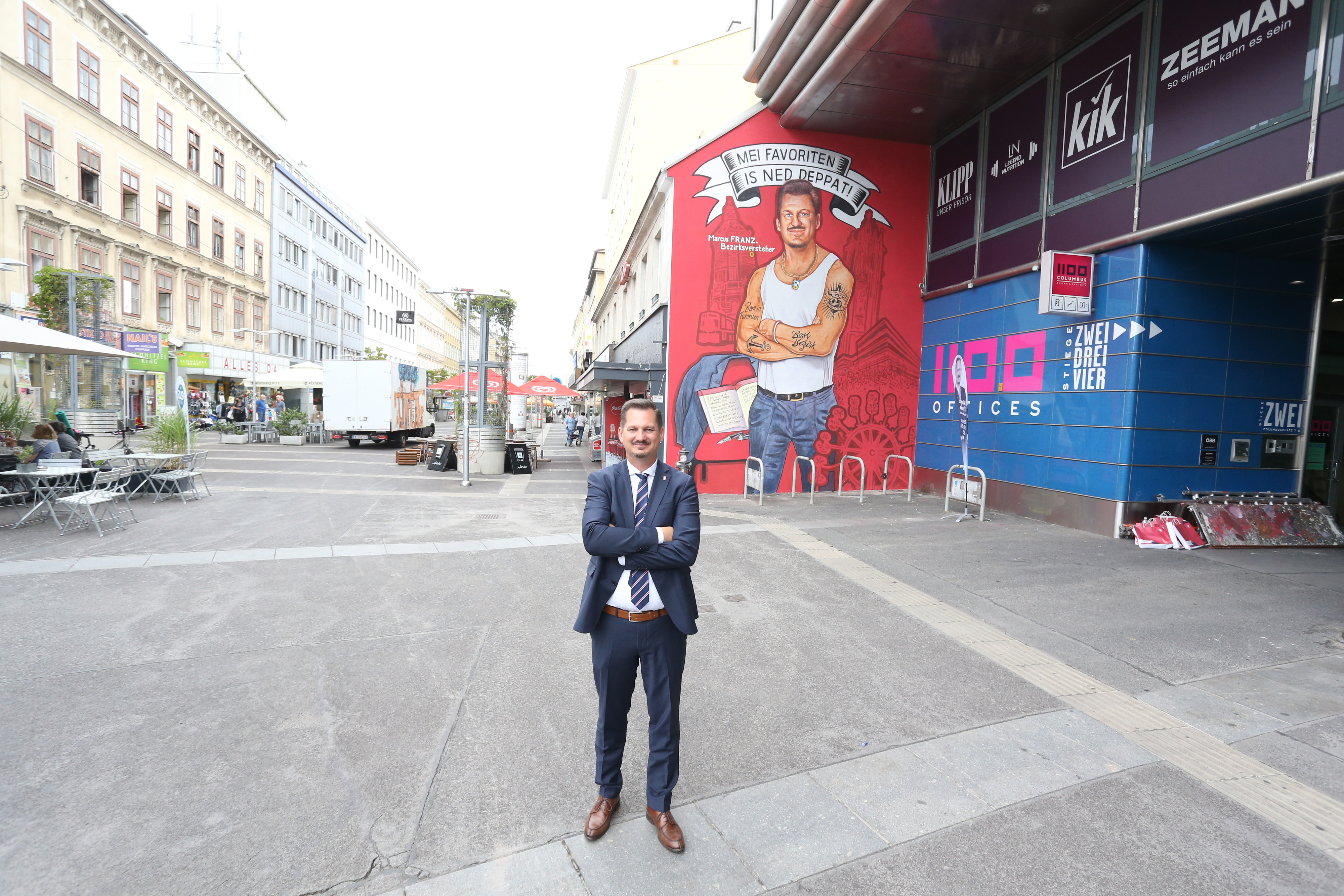Am Columbusplatz enthüllte Bezirksvorsteher Marcus Franz das Wand-Graffiti.