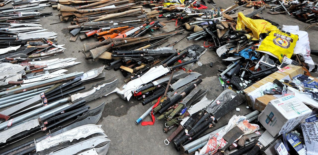 Symbolbild: Illegale Waffen in China, bevor sie in einer Stahlfabrik zerstört werden.