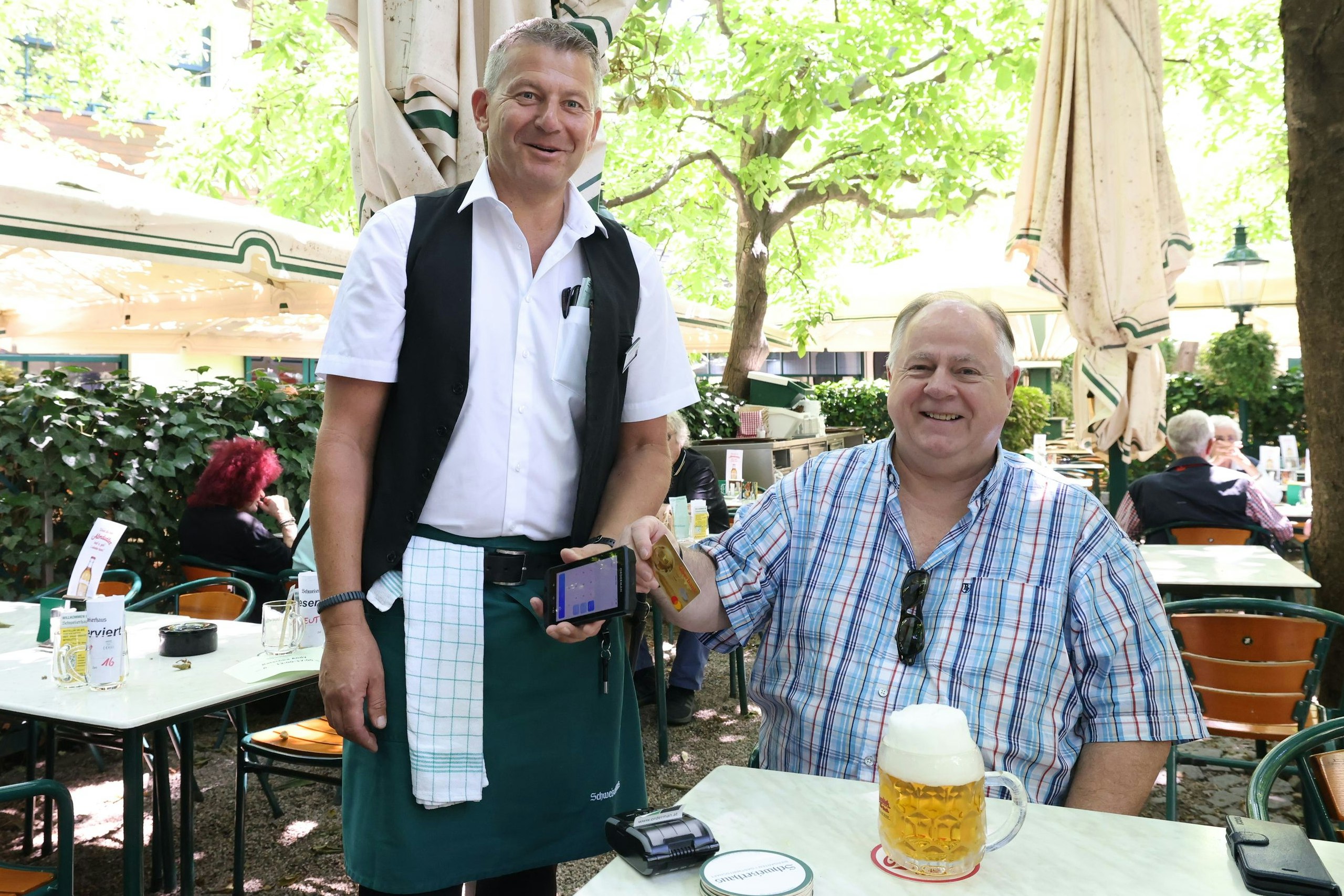 Kellner Heinz (li.) kassiert seit Saisonbeginn auch bargeldlos. Das Trinkgeld wählt Stammgast Toni direkt auf dem Bildschirm aus.