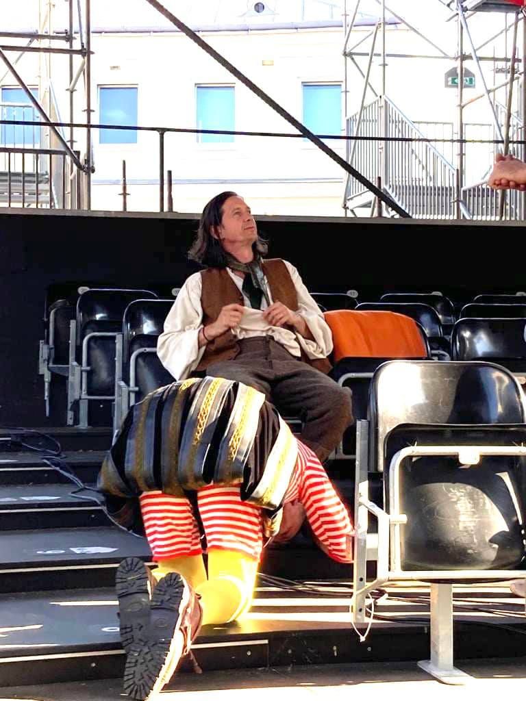Der Intendant des Haager Theaterfests geht vor seinem Schauspieler auf die Knie.