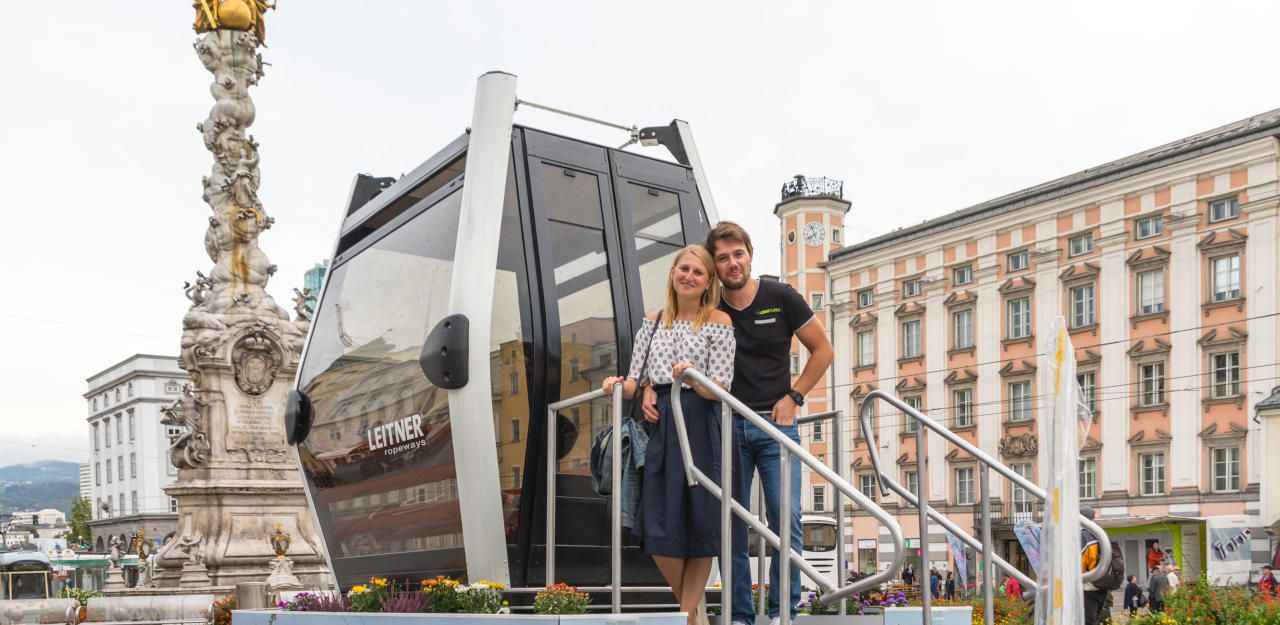 Mit einer Gondel wurde am Linzer Hauptplatz für die Stadt-Seilbahn geworben.