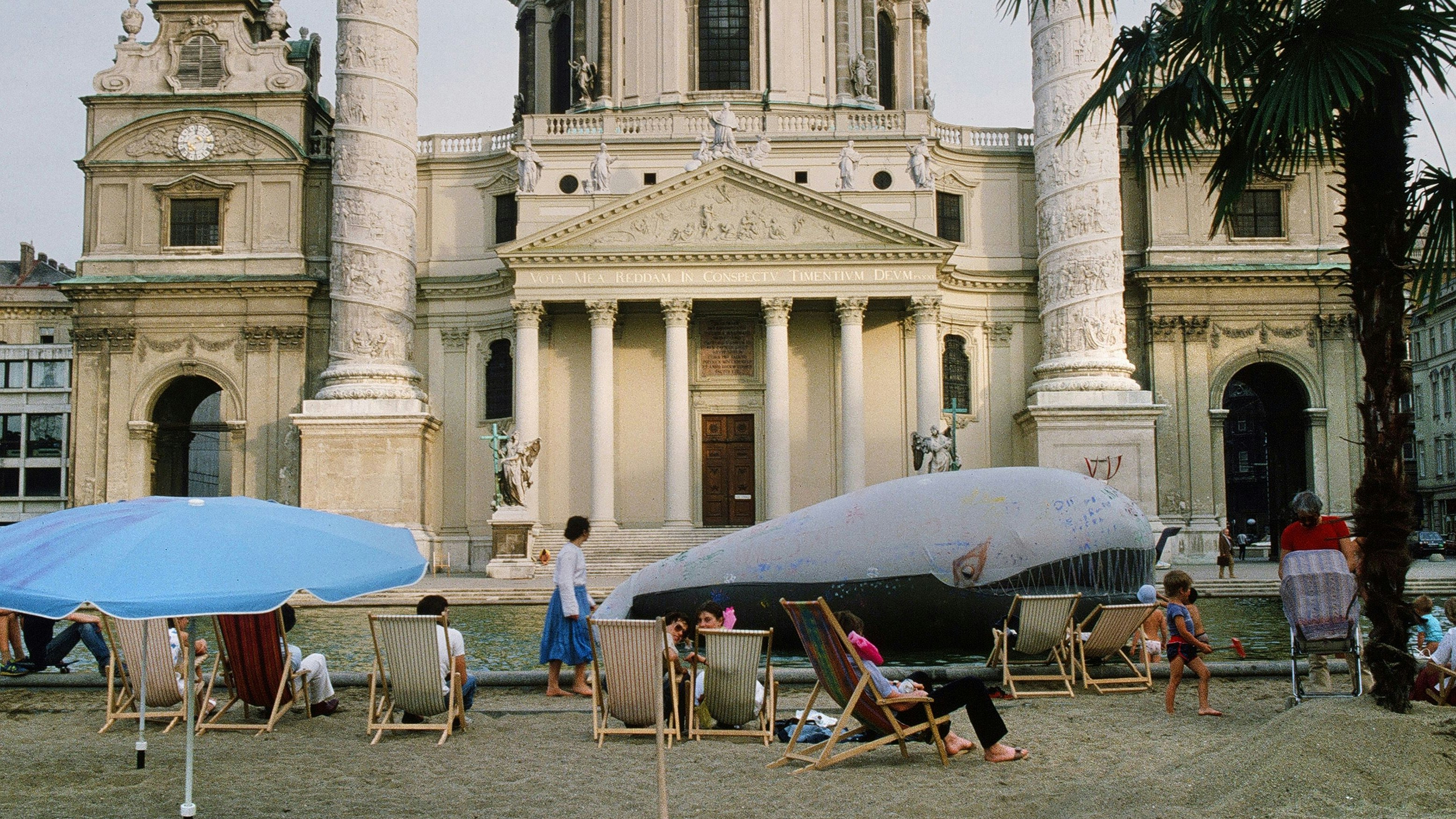 Urlaubsfeeling vor der Karlskirche: Margot Pilz lässt ihr Kunstprojekt "Kaorle (sic!) am Karlsplatz" aus 1982 neu aufleben.