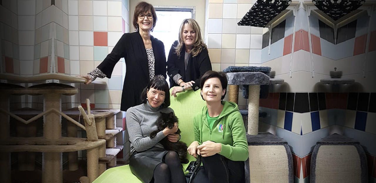 Stadträtin Margarete Josseck-Herdt (Finanzreferentin des Vereins), Tierheimreferentin Silvia Huber (2. Reihe v.l.) sowie Obfrau Sabine Gattermaier (Freunde des Welser Tierheims) und Tierheim-Leiterin Barbara Ogris (1. Reihe v.l.) und Kater Marvin testeten bereits eine der neuen Liegen.
