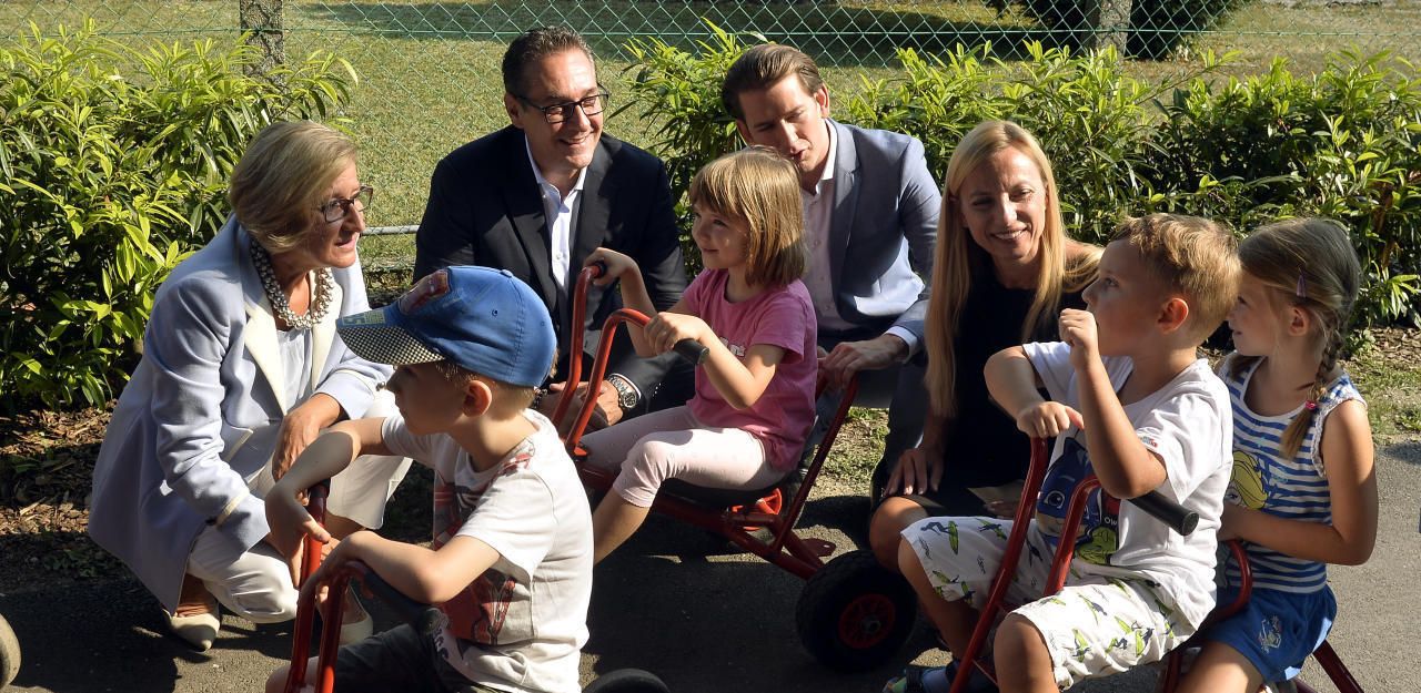 NÖ-Landeshauptfrau Mikl-Leitner, Vizekanzler Strache (FPÖ), Bundeskanzler Kurz (ÖVP) und Familienministerin Bogner-Strauß (ÖVP) präsentierten "Aktuelles zur Kinderbetreuung".