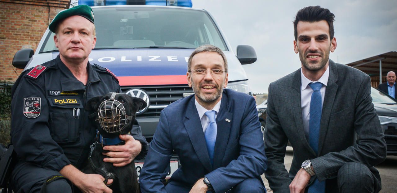 Innenminister Herbert Kickl und Udo Landbauer mit der Diensthunde-Staffel Wr. Neustadt-Süd