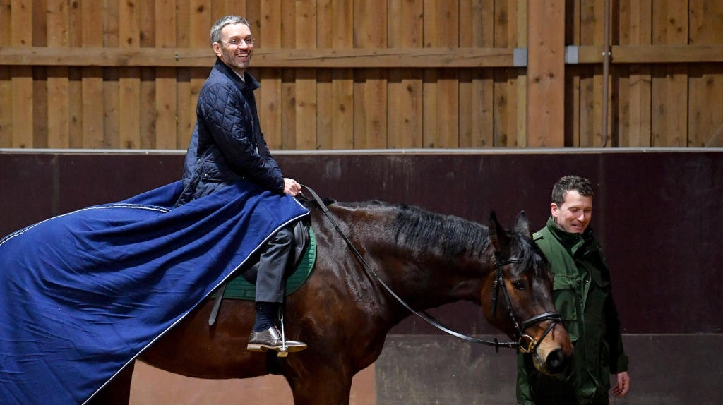 Der damalige Innenminister Herbert Kickl (FPÖ) auf dem Pferd "Karlo" der Reiterstaffel der bayerischen Polizei, am Donnerstag, 15. Februar 2018, in München.