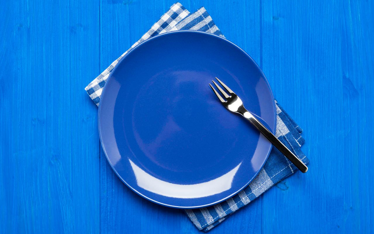 Blue plate with fork on napkin and blue table