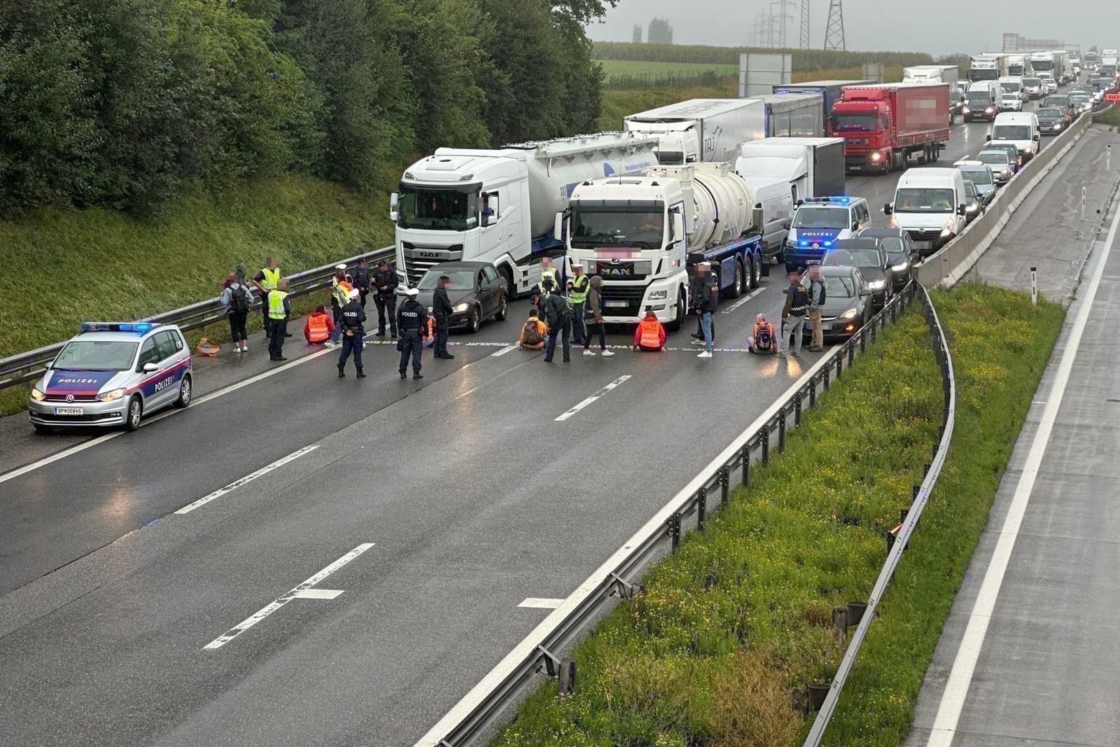 Auf allen drei Fahrstreifen pickten Klima-Chaoten.