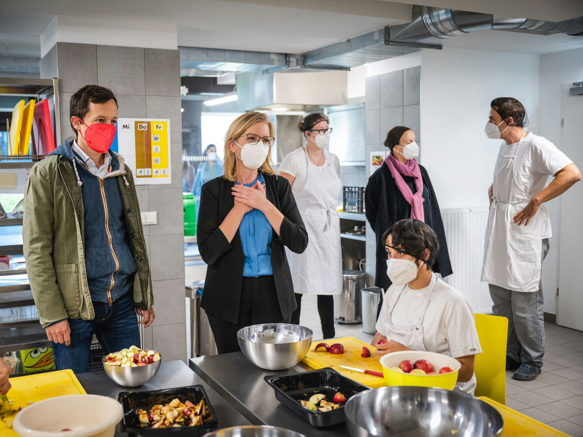 Essen retten, Klima schützen und Sozialprojekte unterstützen. Umweltministerin Leonore Gewessler (Grüne) im Bild mit Caritas Generalsekretär Klaus Schwertner in der Caritas Werkstätte Am Himmel.