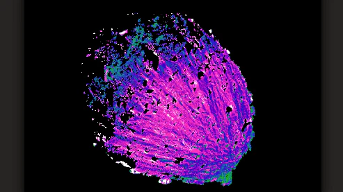 Der Mond Dimorphos wenige Sekunden vor dem Einschlag der DART-Raumsonde. Deutlich zu sehen: fächerförmige Streifenmuster (farbig hervorgehoben)