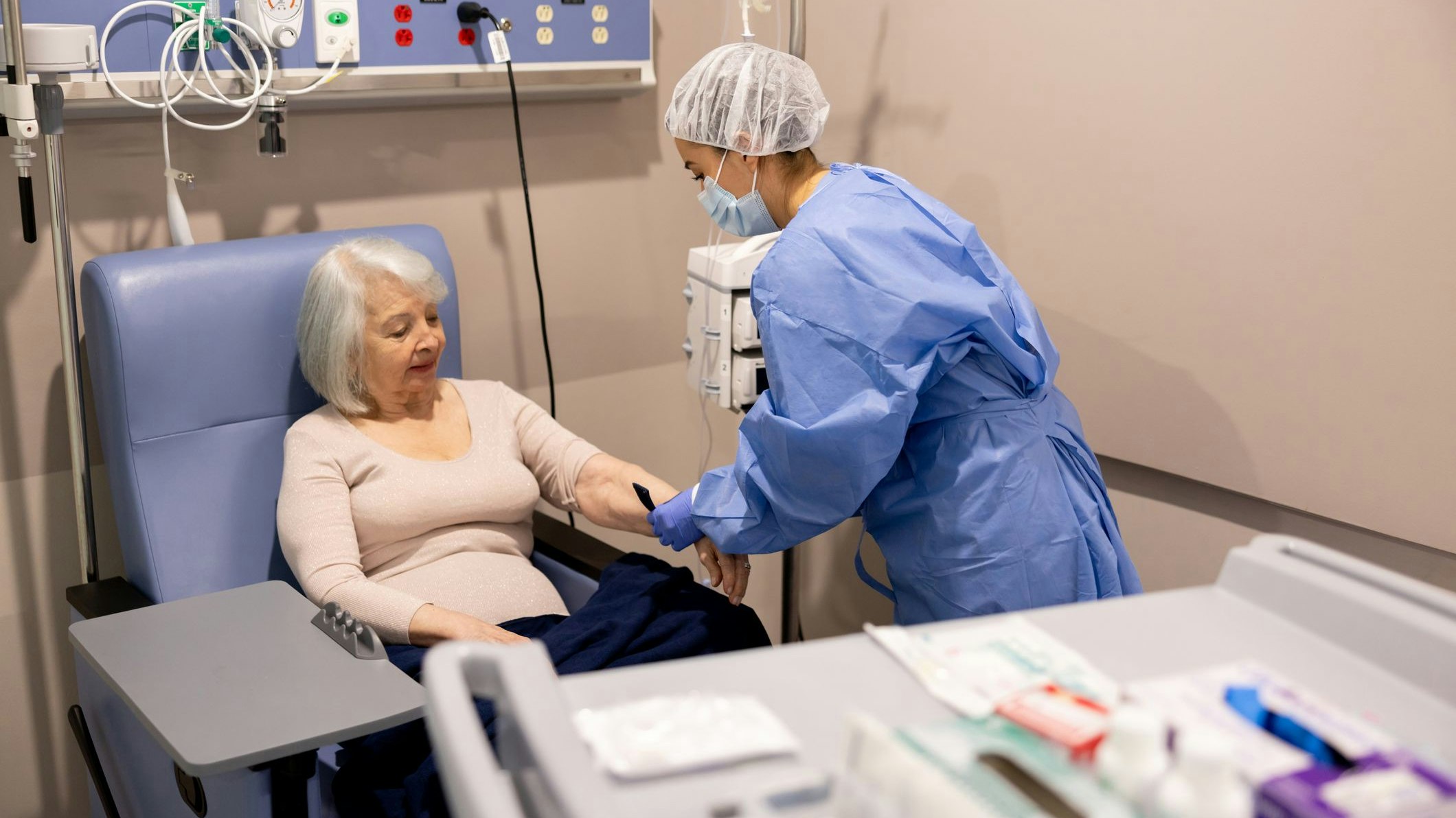 Krankenschwester bereitet eine Krebspatientin auf ihre Chemotherapie im Krankenhaus vor. (Symbolbild)