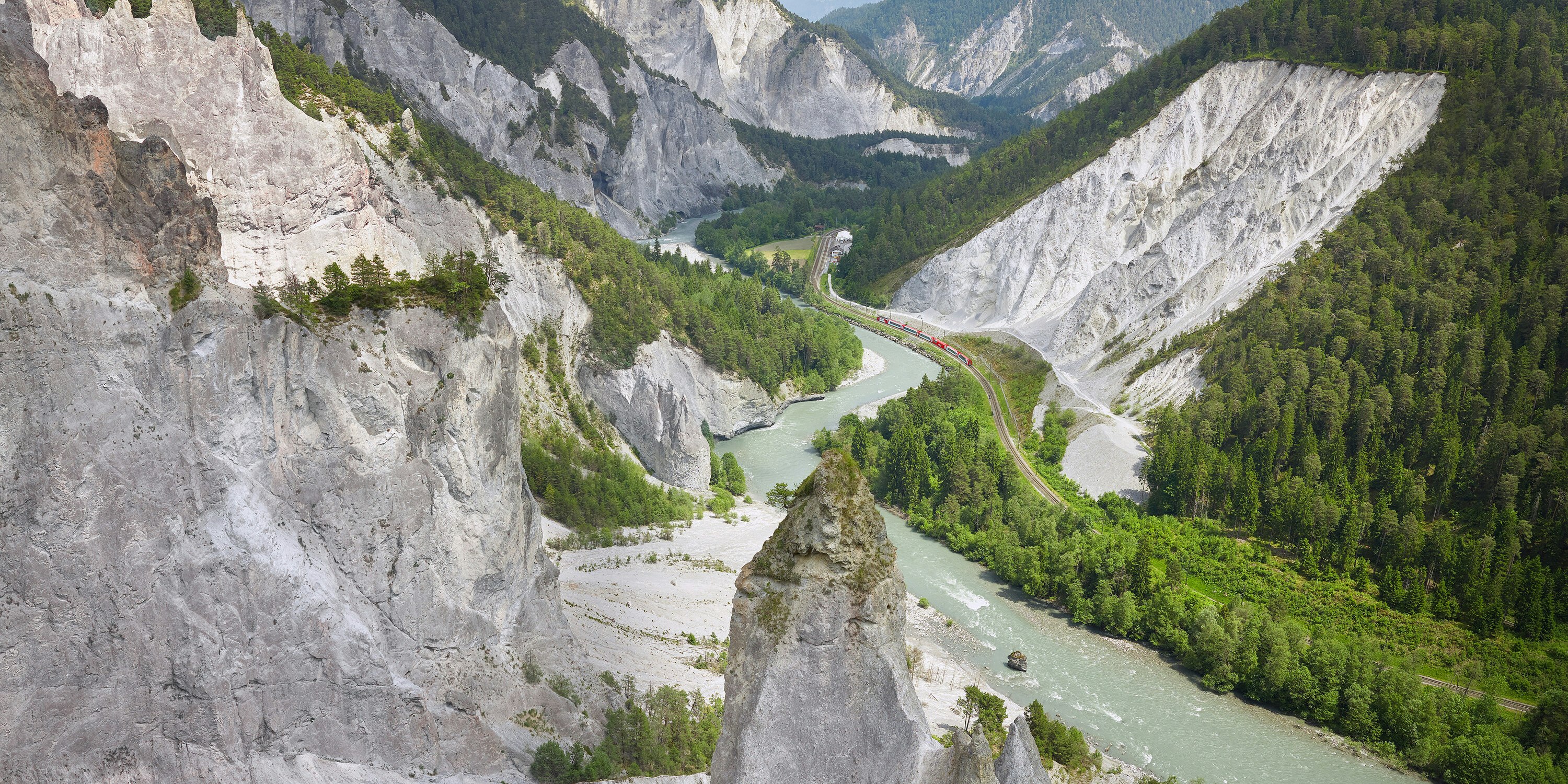 Auf seinem Weg passiert der Zug die monumentale Rheinschlucht zwischen Ilanz und Reichenau